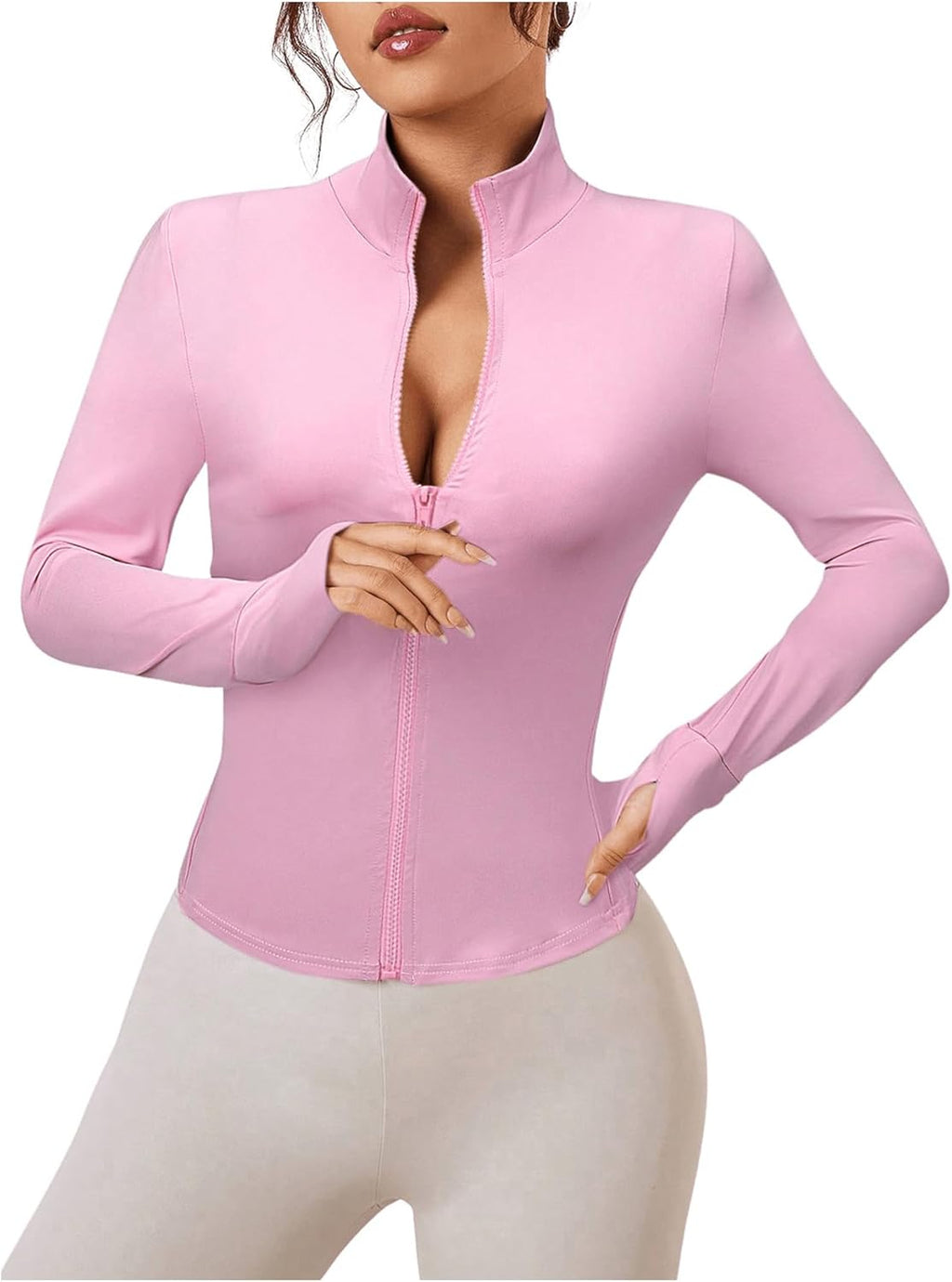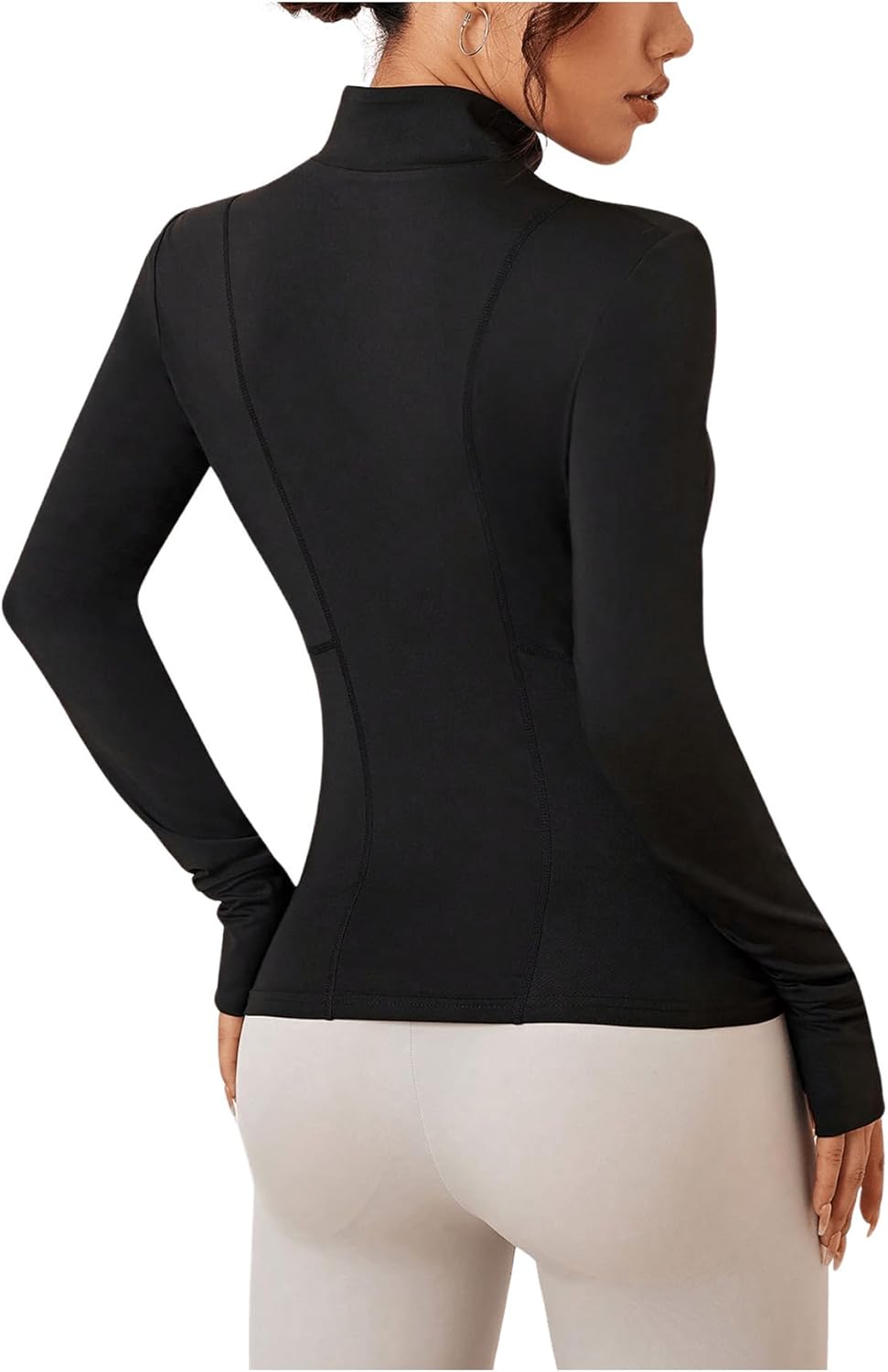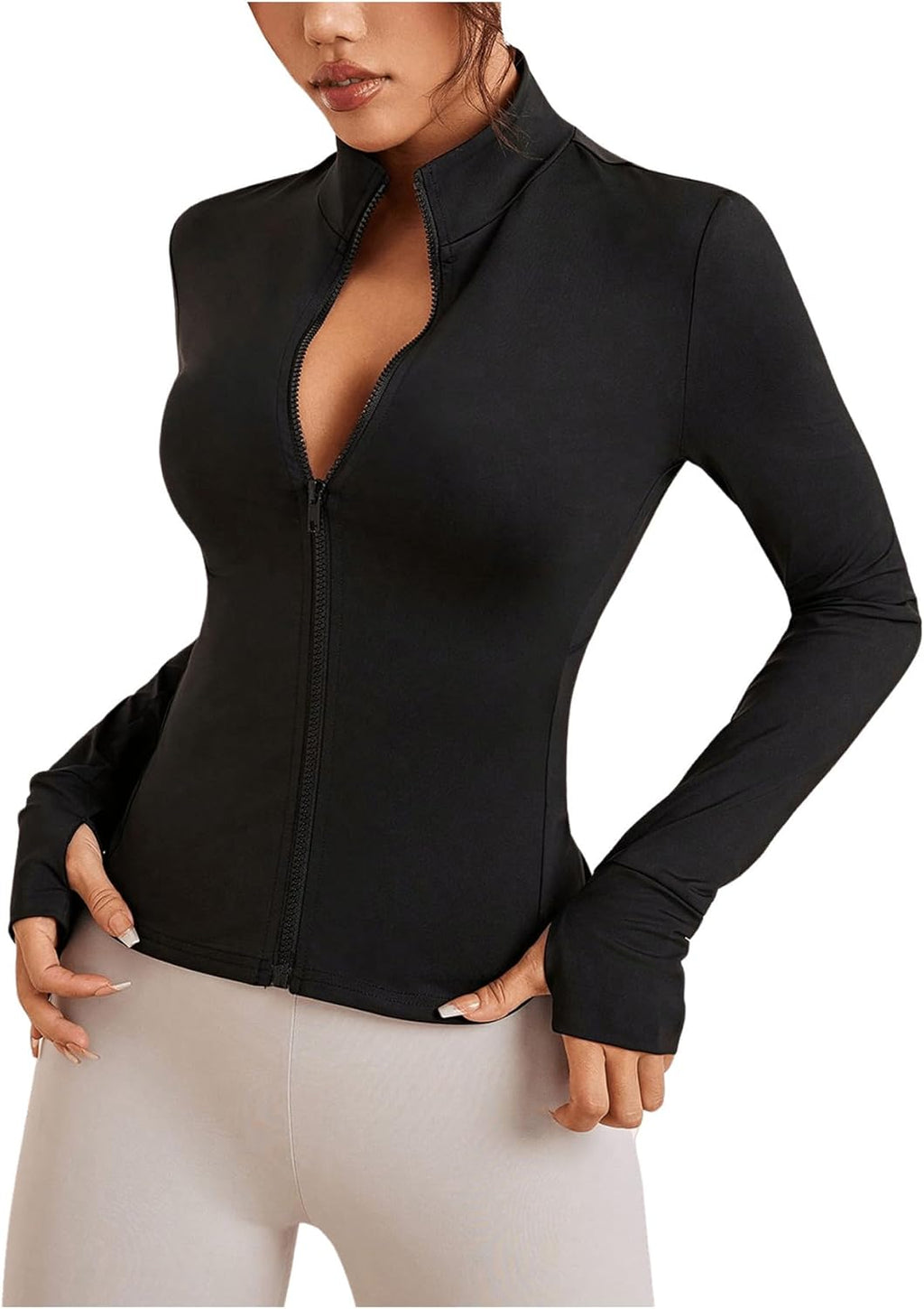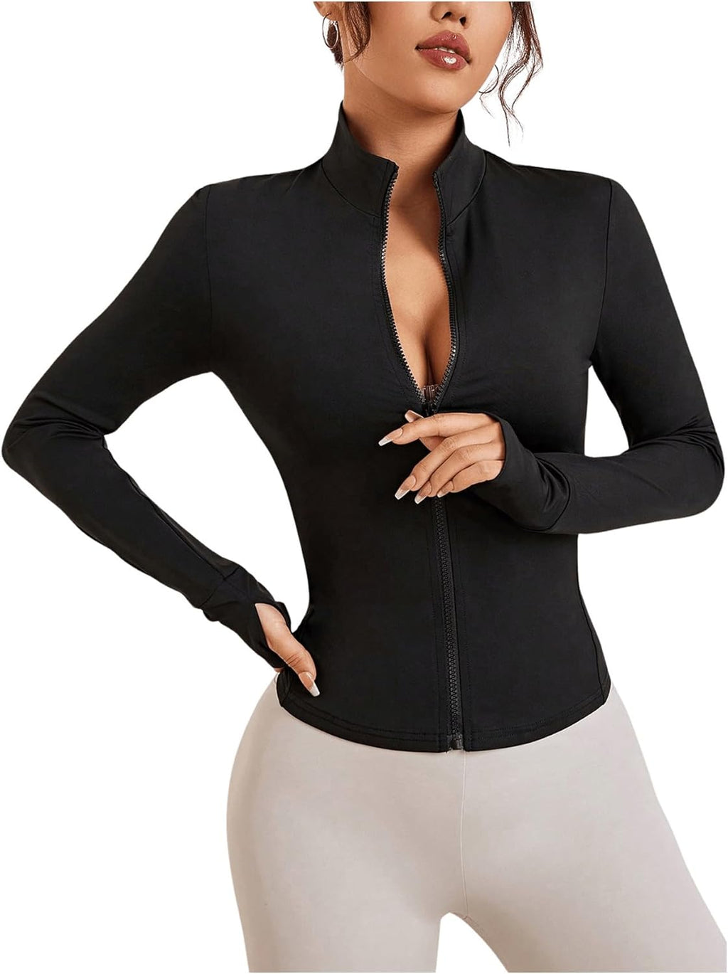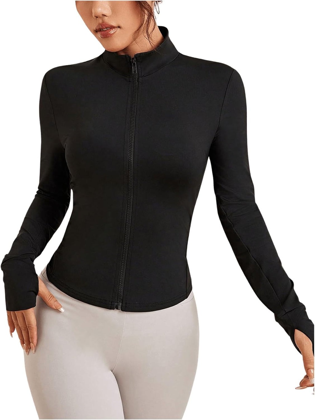 Com caimento justo, zíper frontal, gola redonda e orifícios para os polegares, oferece ajuste seguro e visual atlético.