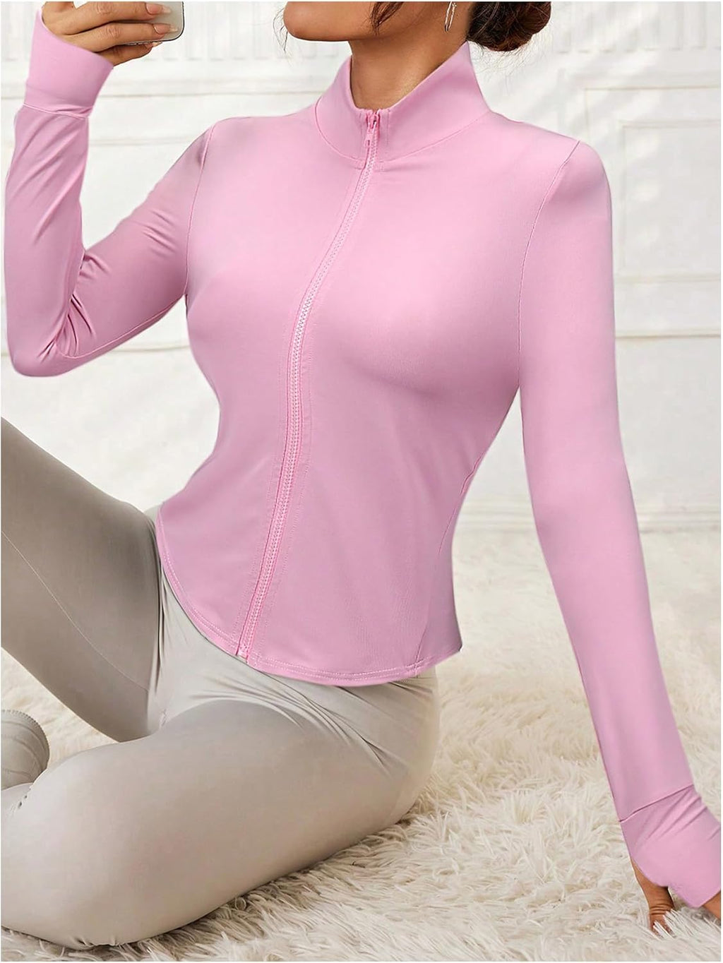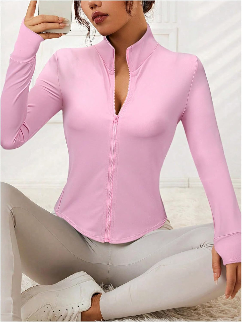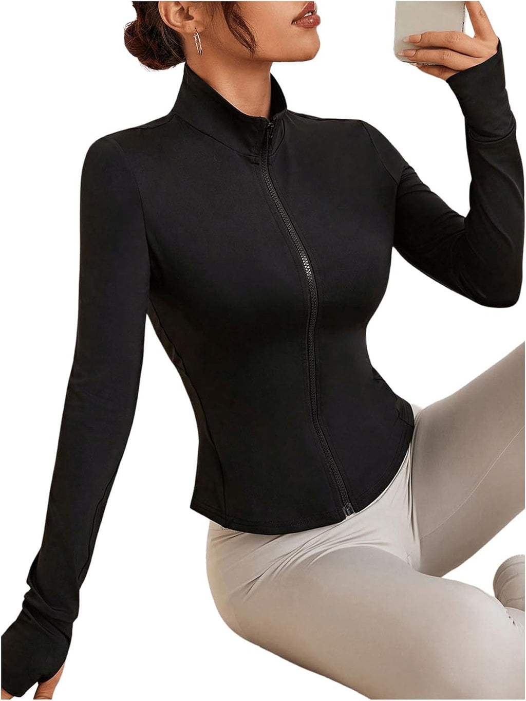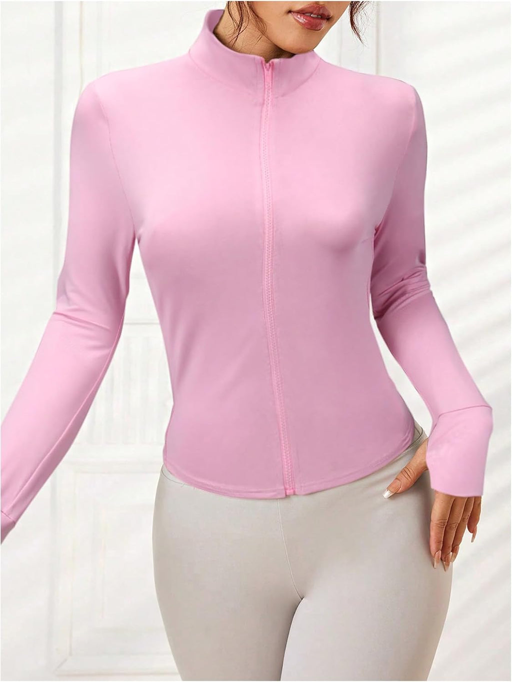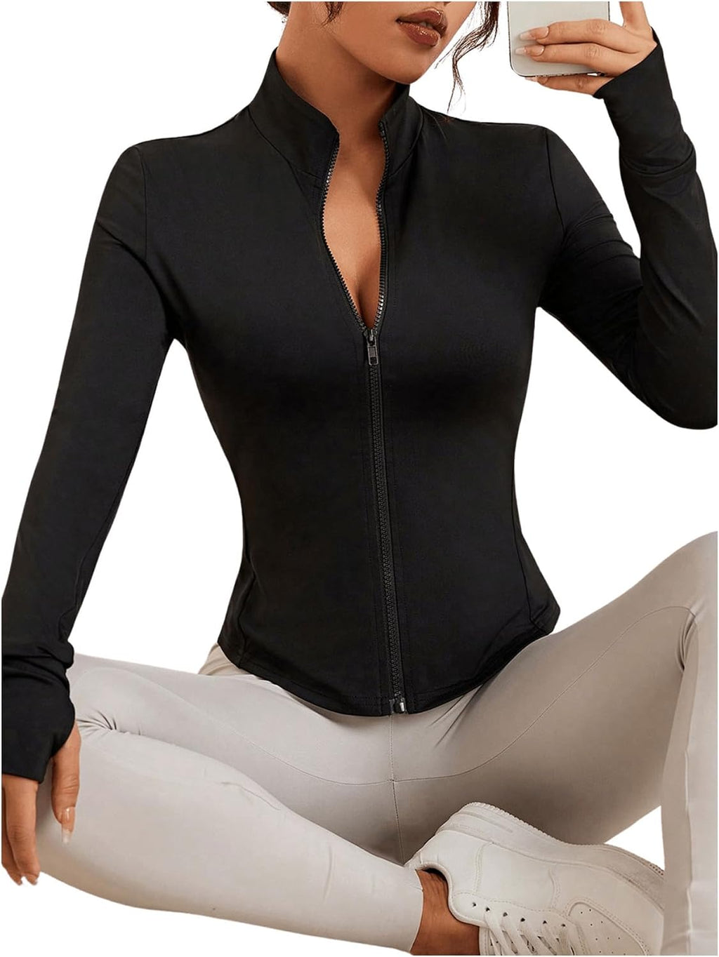 Com caimento justo, zíper frontal, gola redonda e orifícios para os polegares, oferece ajuste seguro e visual atlético.
